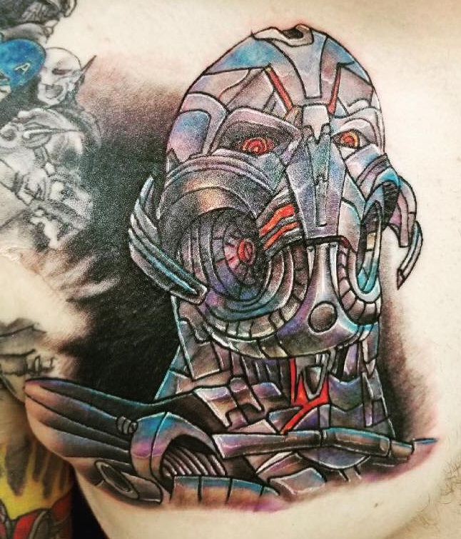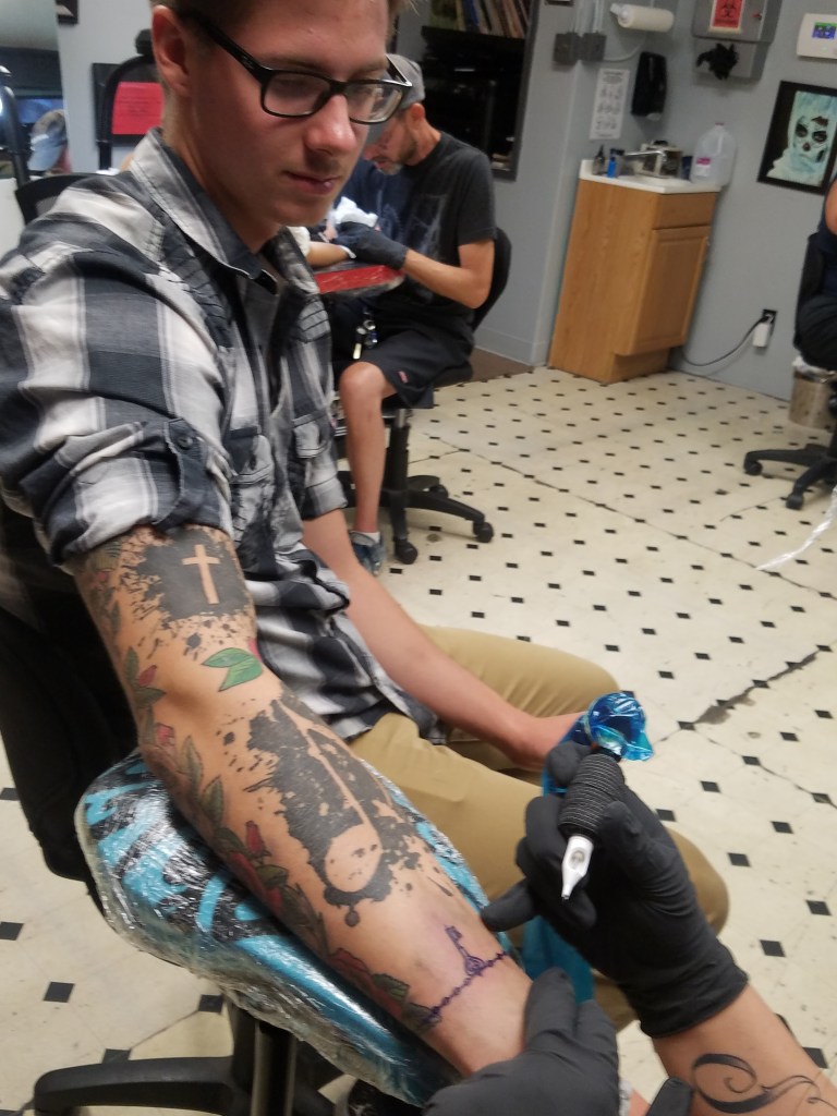 We offer free assessments of Tattoo Regrets and will let you know what kind of cover up is possible, if any, or if laser tattoo removal treatments are necessary first. Below are before and after photos of a cross turned into a superhero to better complement the clients shoulder and sleeve superhero design.