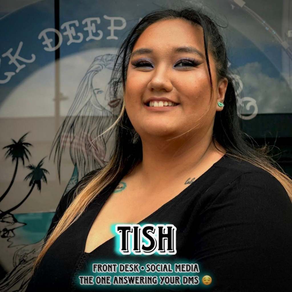 Tish has been with Neck Deep Tattoo from the very beginning making sure clients have a enjoyable tattoo experience. It is Tish’s smiling face that will greet you as you walk into the shop and she will help you get the paperwork you need if you are getting a tattoo or can help get you a quote on a tattoo you are thinking about then schedule your appointment with one of our talented tattoo artists.