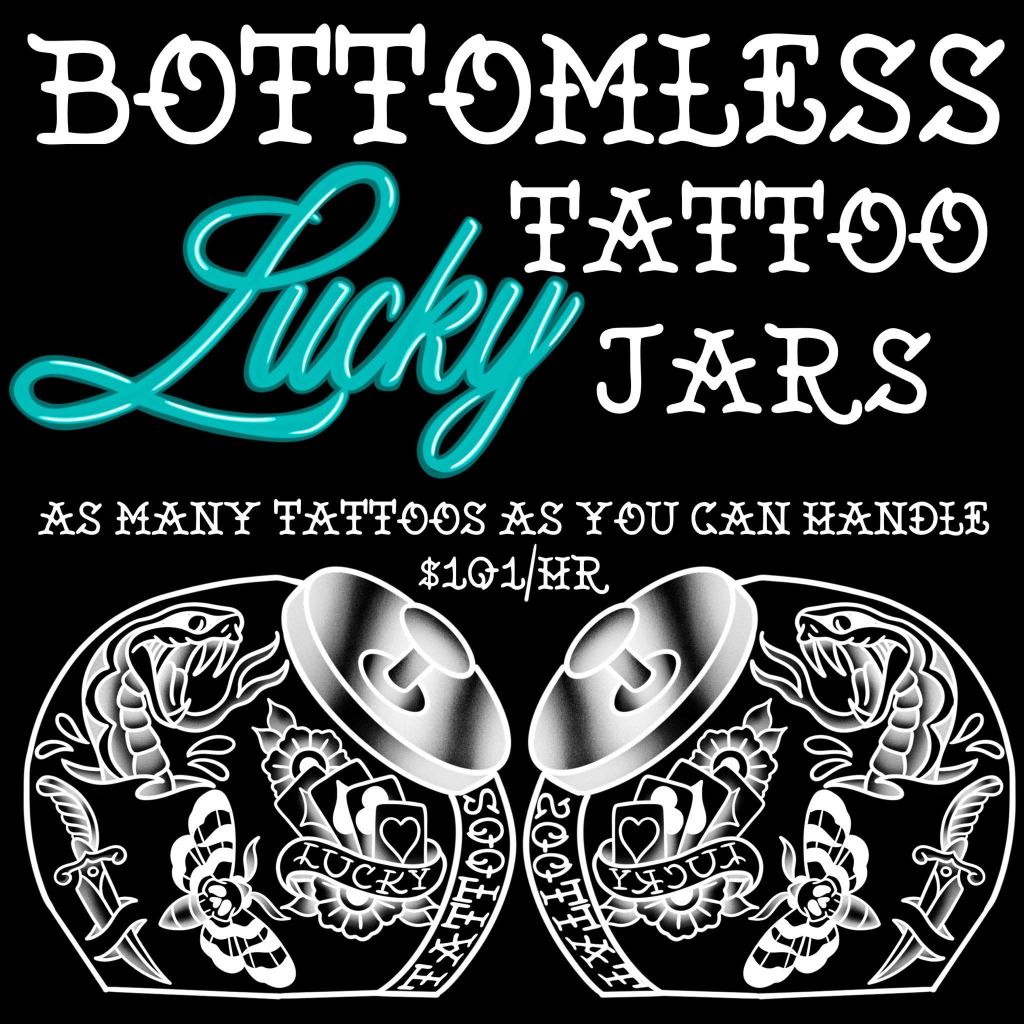 Limited Time Lucky Tattoo Jar Special $101 per hour for unlimited Lucky Tattoo Jar tattoos. Pick the designs you want from the jar and the time starts when the needle hits your skin. Linework, shading, color, UV ink is all included. No restrictions on placement on the body. Below is a arm sleeve of Lucky Tattoo Jar picks created in 4 hours by our Tattoo Artist Mike Crinella. Call Neck Deep Tattoo at 808-200-0161 for more info or just walk-in at 46-178 Kahuhipa St Kaneohe.