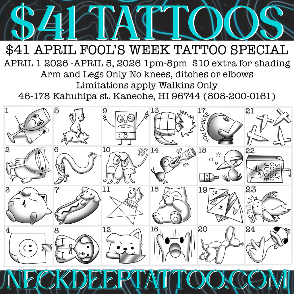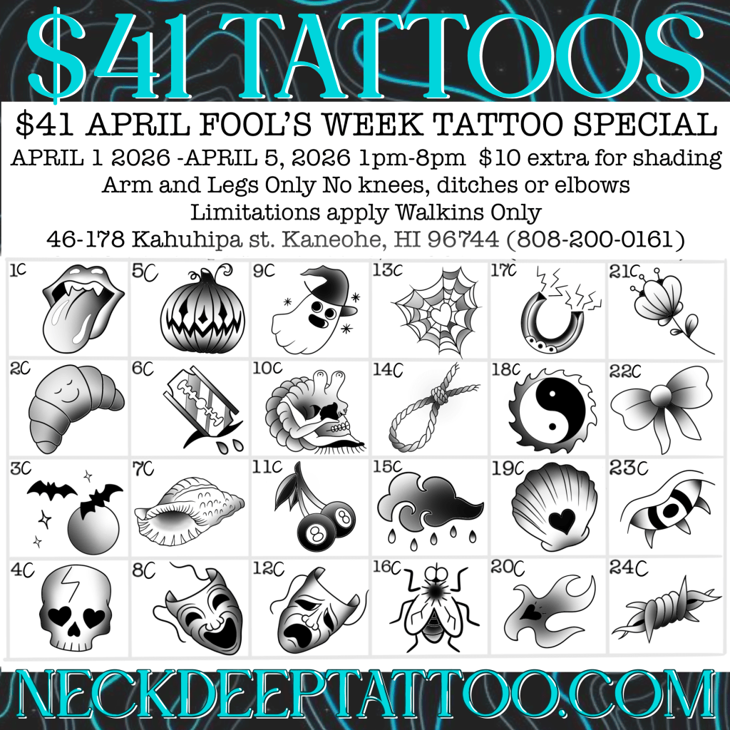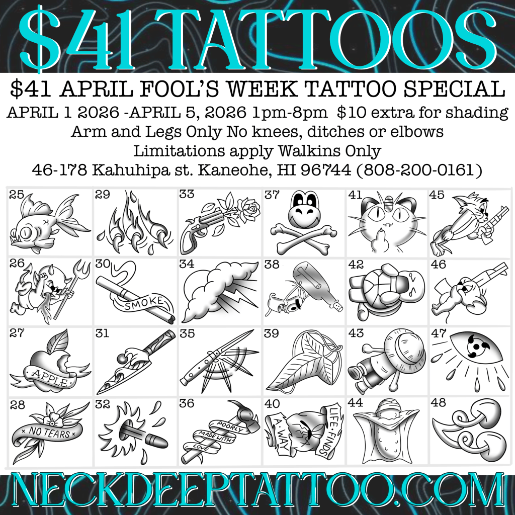 Don’t be a fool, come to Neck Deep Tattoo the first week of April and choose from over 100 awesome flash designs for $41! No joke, just $41 each tattoo and there is no limit on how many designs you can get. Add shading for an additional $10. Join us April 1-5 from 1PM–8PM for this April Fools $41 Tattoo Special!