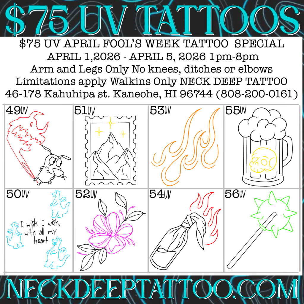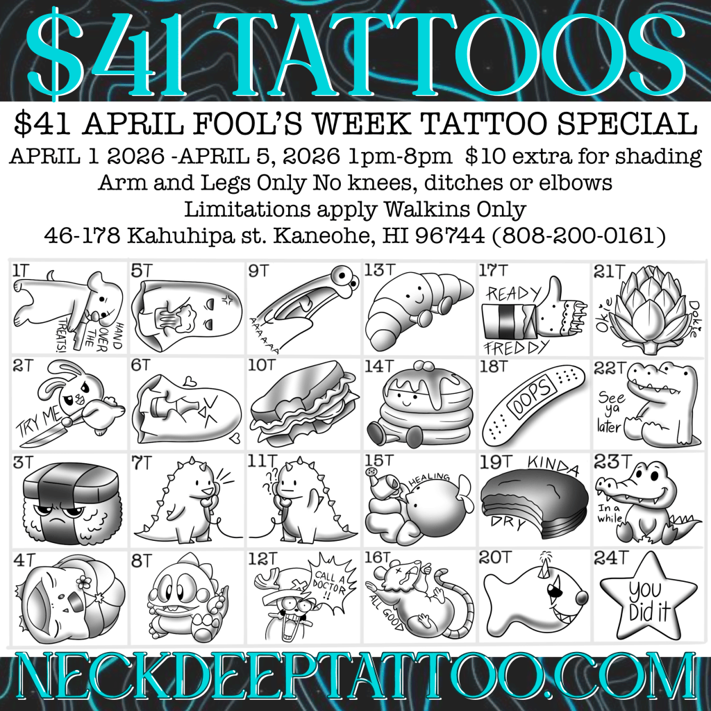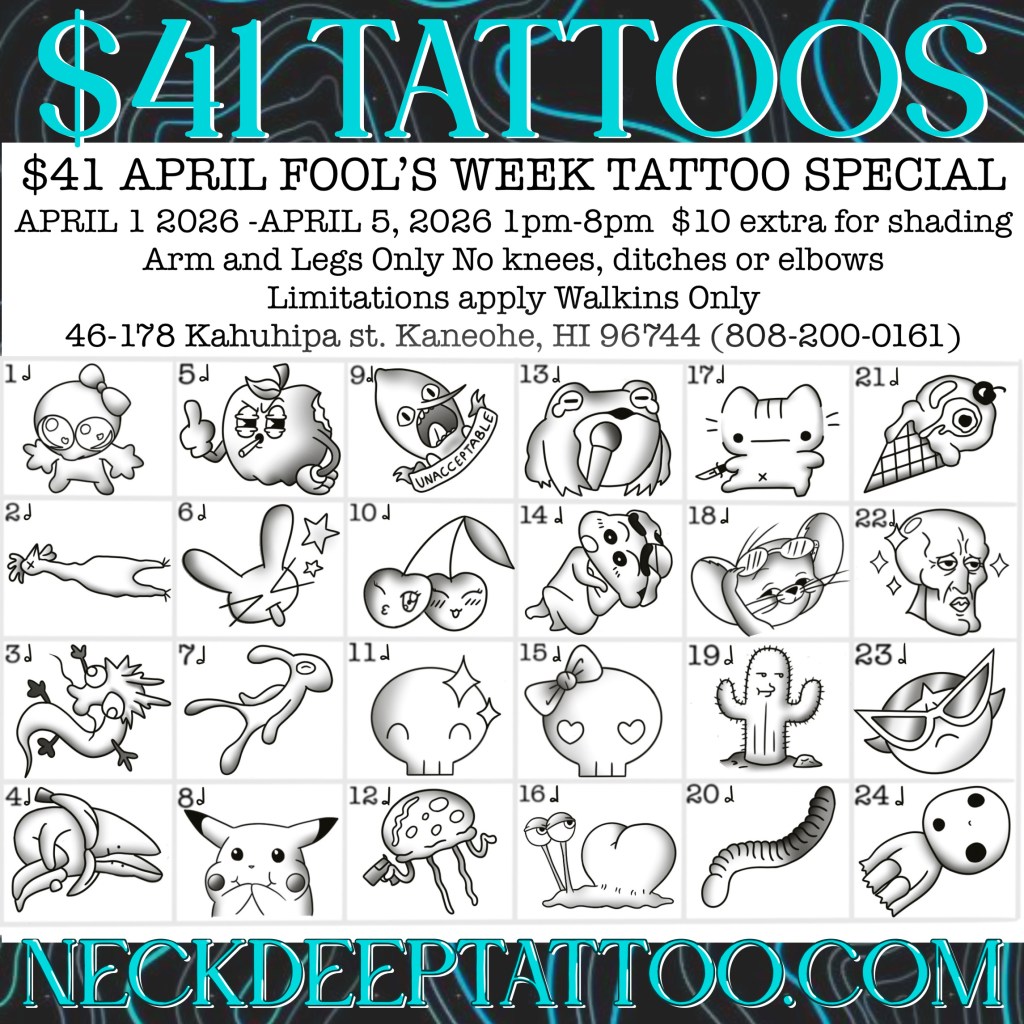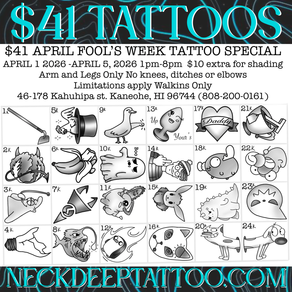 Don’t be a fool, come to Neck Deep Tattoo the first week of April and choose from over 100 awesome flash designs for $41! No joke, just $41 each tattoo and there is no limit on how many designs you can get. Add shading for an additional $10. Join us April 1-5 from 1PM–8PM for this April Fools $41 Tattoo Special!