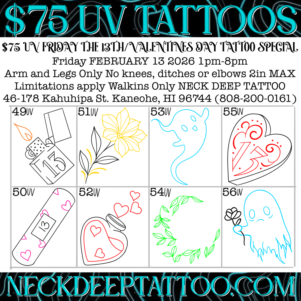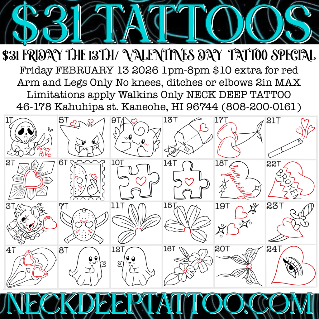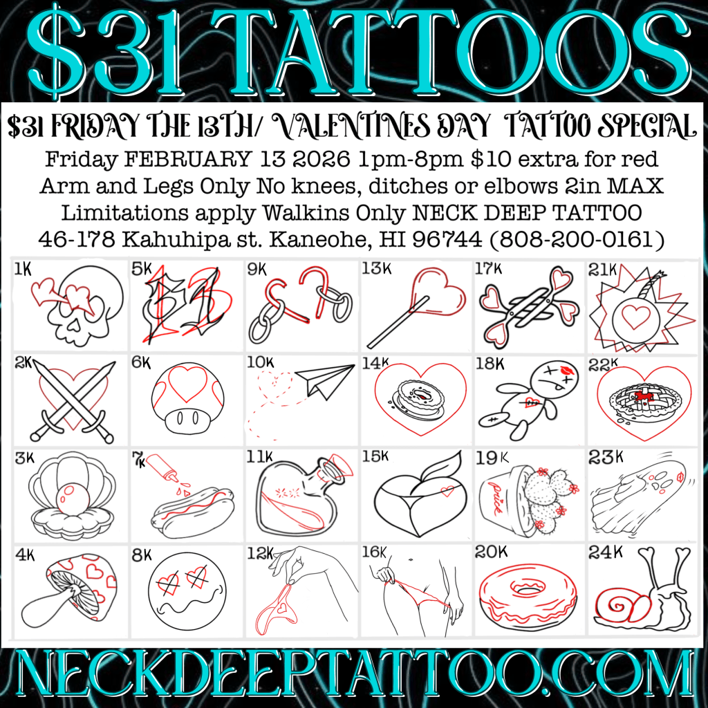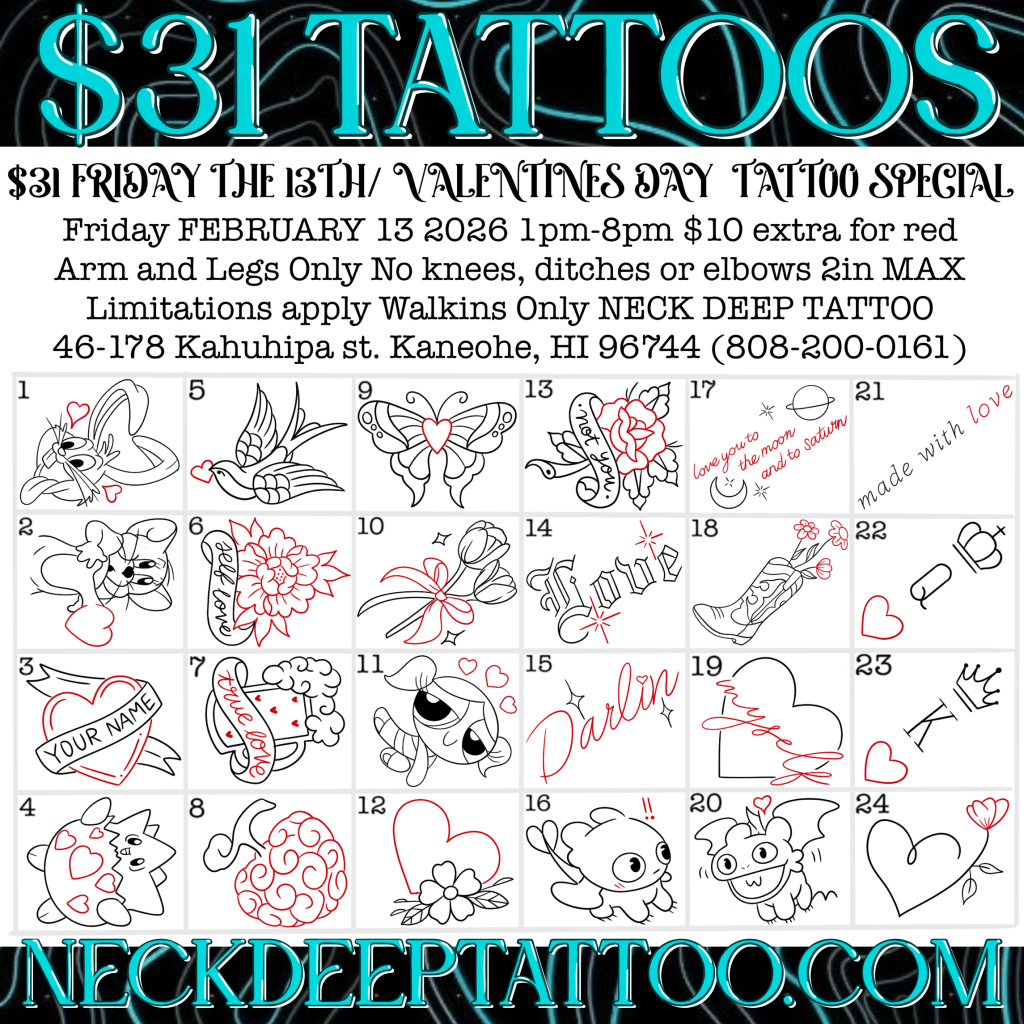 😍$31 tattoos with over 100 flash designs to choose from! Join us Friday, February 13 from 1PM–8PM for this $31 Tattoo Special at Neck Deep Tattoo! Don’t be heartbroken if you can’t make it, just call 808-200-0161 to be put on our rain check list and you can come on 2/14 1PM-8PM and get the $31 tattoo specials.