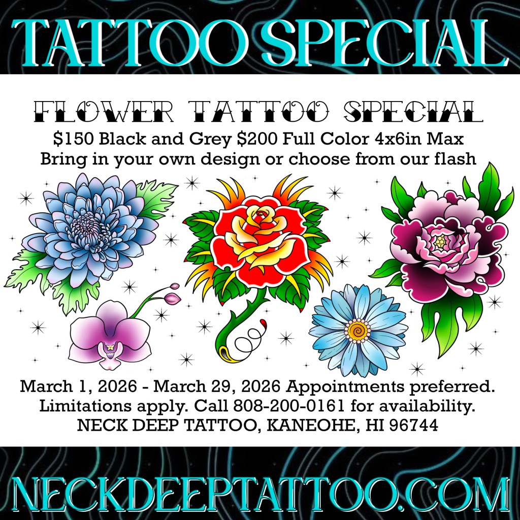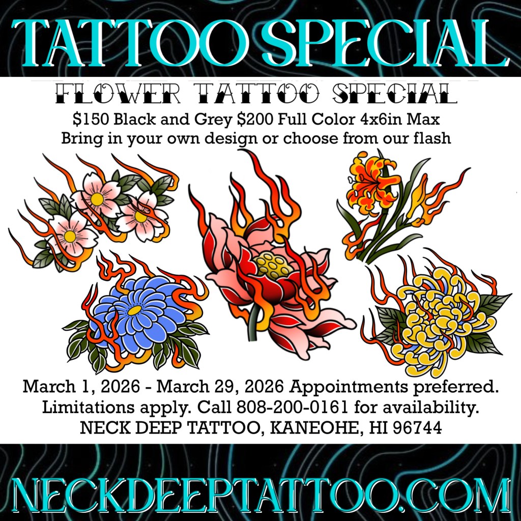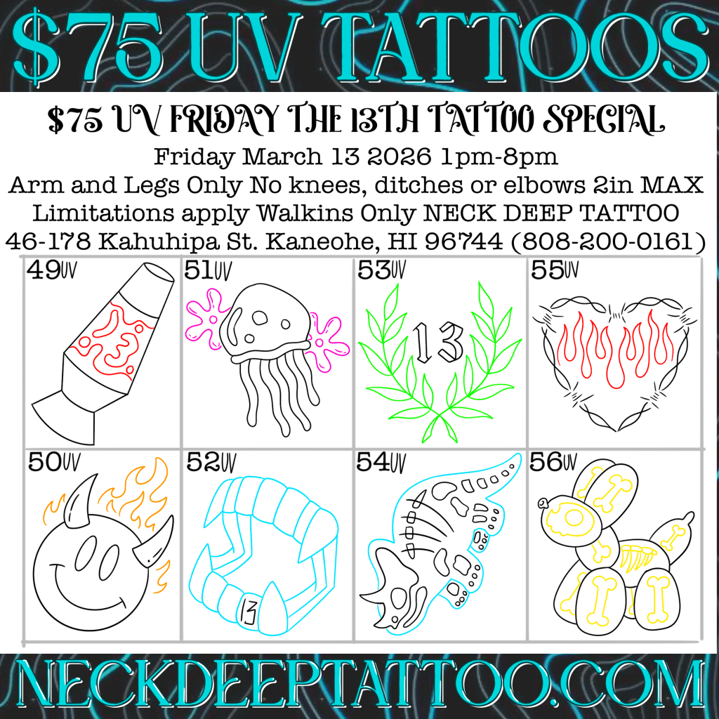 🌋Neck Deep Tattoo 46-178 Kahuhipa Street, Kaneohe. Open 1-7pm Wednesday through Sunday for appointments and walk-ins.
