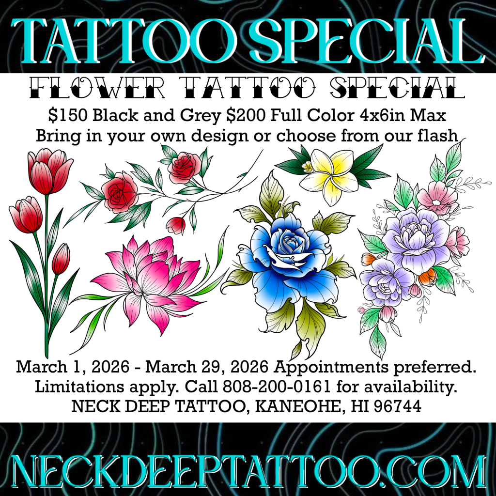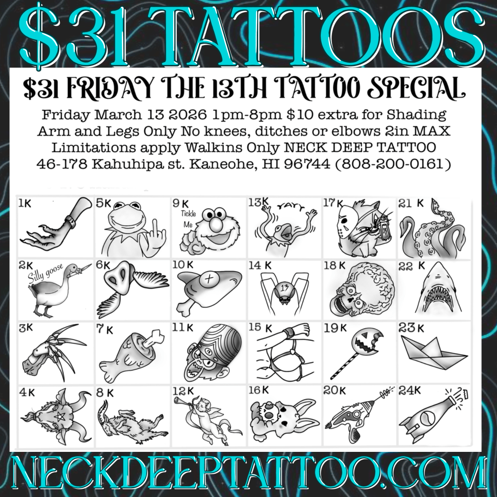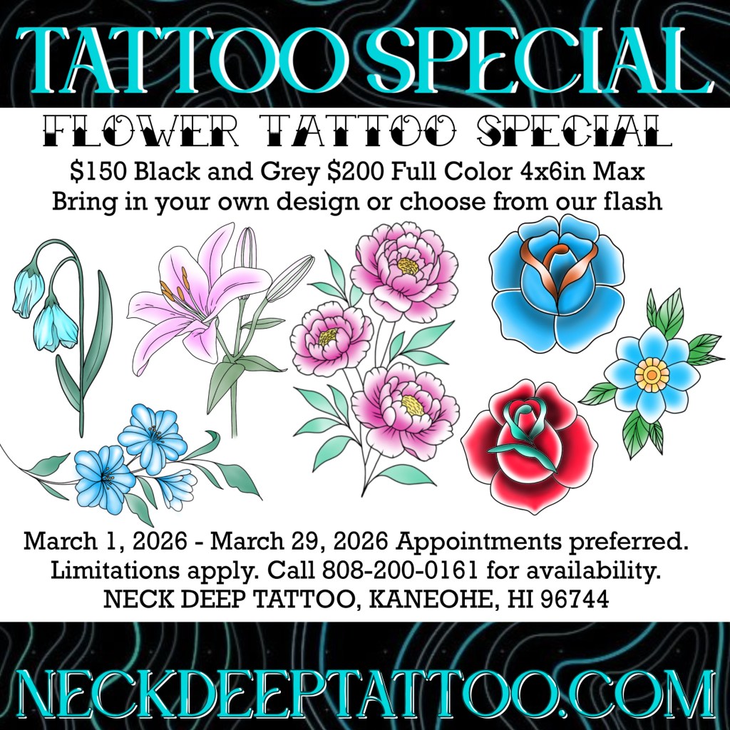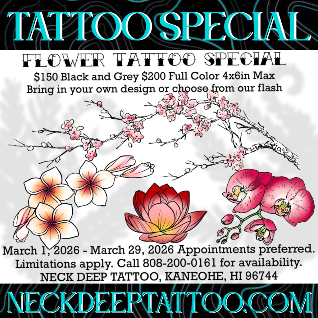 🌋Neck Deep Tattoo 46-178 Kahuhipa Street, Kaneohe. Open 1-7pm Wednesday through Sunday for appointments and walk-ins.