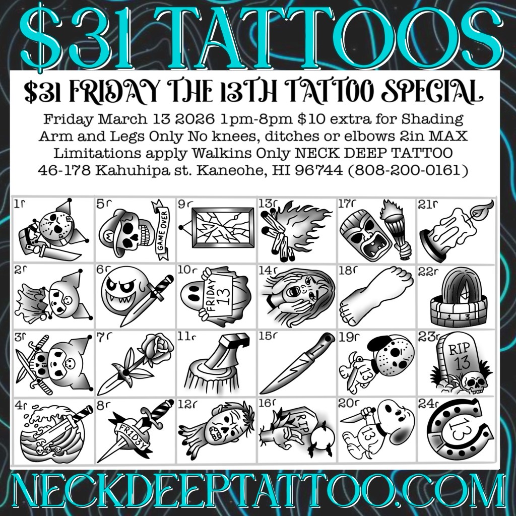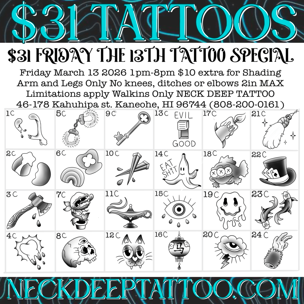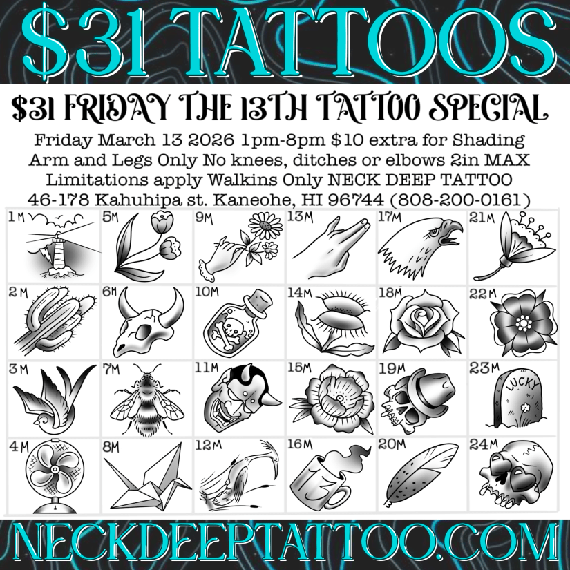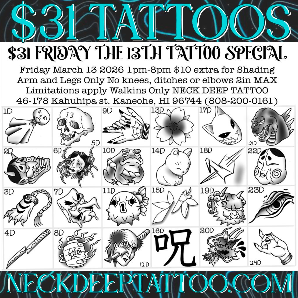 Make Friday the 13th your lucky day with $31 tattoo specials. There are over 100 flash designs to choose from! Join us Friday, March 13 from 1PM–8PM for this $31 Tattoo Special at Neck Deep Tattoo!