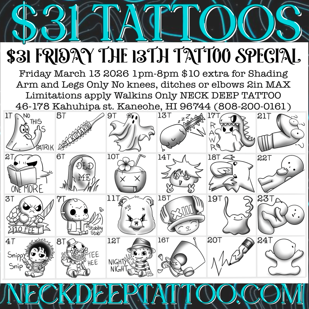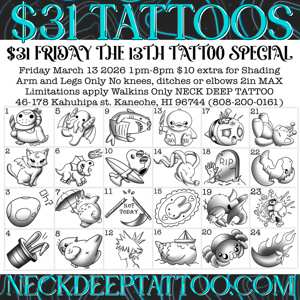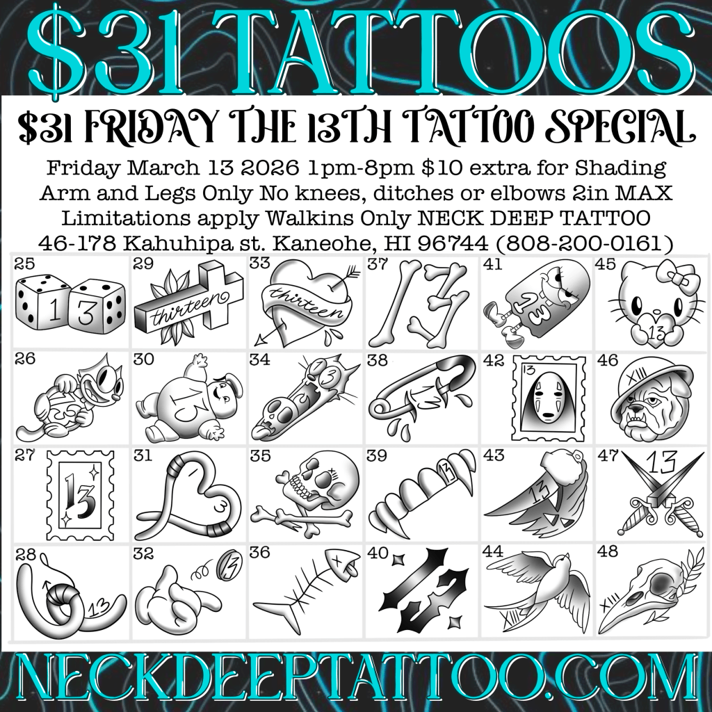 Make Friday the 13th your lucky day with $31 tattoo specials. There are over 100 flash designs to choose from! Join us Friday, March 13 from 1PM–8PM for this $31 Tattoo Special at Neck Deep Tattoo!